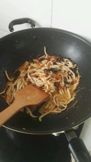 然后锅里放油,把全跟姜爆香,把胡萝卜跟木耳放入,加入剁辣椒,白糖,醋,盐,十三香,海鲜酱油,稍微加一点水!