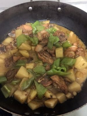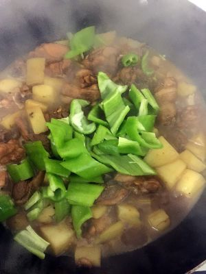 最后放入青椒块 葱头块炖五六分钟 最后放点儿酱油和盐调下味出锅