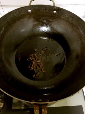 锅内放油,油要适当多一点,加入花椒,炒香,把花椒盛出来