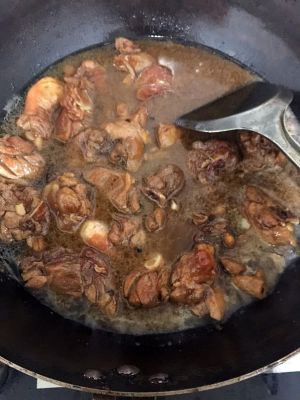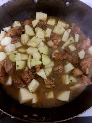 等香味都出来了下入鸡肉块炒一段时间把水分煸出去一些 然后加入白糖 啤酒和土豆炖煮 啤酒的量要刚刚好和食材平行 炖上8分钟