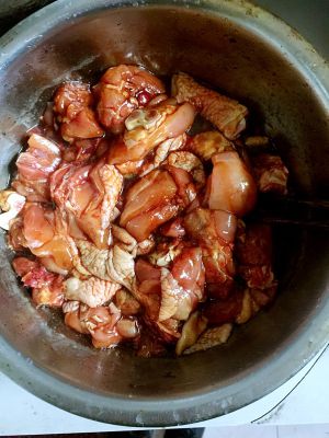 然后把鸡肉用葱 姜 料酒 老抽腌半小时