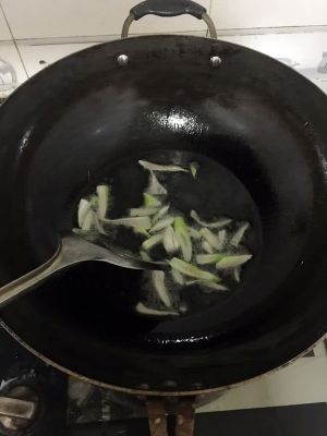 收汁到水少之后加入青椒,淋入香油,翻炒几下可以出锅了