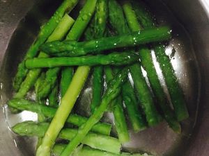 芦笋焯水,加一点点盐一点点油。开水下锅,半分钟就可以了,时间过久影响爽脆口感