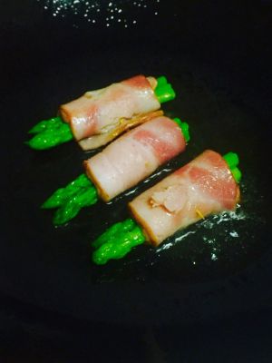 培根打开,一片包三根芦笋卷紧,用牙签封口;