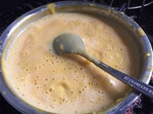 把牛奶加热至冒泡,慢慢的倒进蛋黄液中,一定要注意,边倒边搅拌,否则就成了蛋花汤
