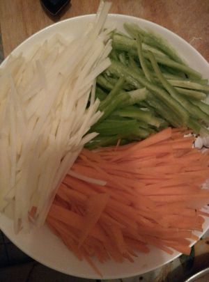 土豆,胡萝卜,青椒,切丝,葱,姜,切碎。