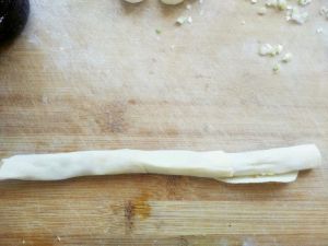 肉末葱花,摊在面皮上。卷起,卷成圆形