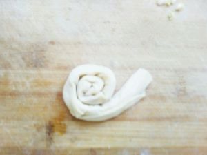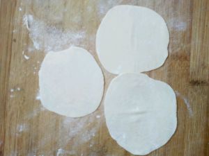 三个面团压成圆饼后,一个放中间,其它两个一边一个地把中间的包起来。
