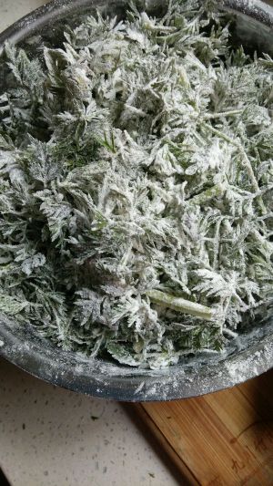 用清水洗干净,放到一个盆中,撒入面粉,搅拌均匀…