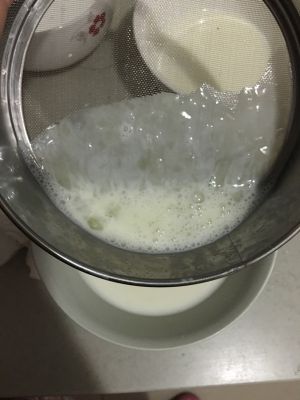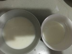 左边过滤后的蛋清牛奶,右边是之前剩的少量牛奶(浮着奶皮的),把左边碗里的蛋清牛奶混合液倒入右边的碗里(倒的时候,用一只筷子将右边碗里漂浮的奶皮轻轻拨开一条小缝)