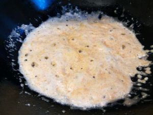 锅中倒入少许底油加热放入浓香的鸭蛋黄(最好提前用勺子碾碎)