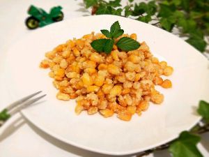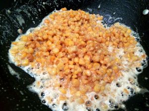 锅中放加热,放入玉米粒炸至金黄,出锅沥油。