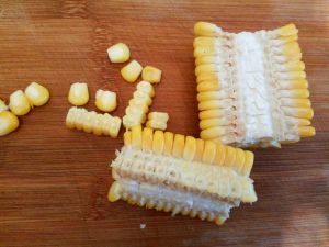压熟的玉米,对半切开,刀顺着一边,就可以整齐的把玉米粒切下来了,