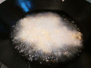 锅里放油,放一粒玉米粒试一下,放下去马上浮起,说明油温可以了.裹好的玉米粒,过筛一下,放下去油炸,等玉米淀粉定型以后,用铲子轻轻推动,玉米粒变黄,浮起,就可以捞出,