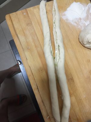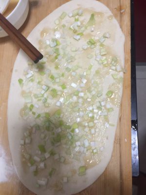然后把面擀成长长的形状,放入刚刚做好的油酥 然后放入葱花, 在从一侧卷起,