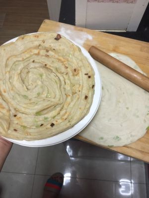 然后对着切口向上,卷起来,放至5分钟 电饼档放油预热,把卷好的葱油饼擀成薄饼 放入电饼档直至两面发黄 这样葱油饼就做好啦,看着是不是很美味呢