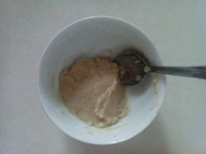 制作油酥,碗中放大约两瓷勺面粉,在面粉中加入适量盐和调味料,拌匀。植物油在锅中烧热,用铲子一点点将油盛入碗中,将油与面粉搅拌均匀,如图所示~