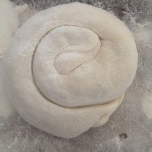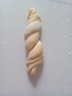 将面饼从两边卷到中间,然后拧成麻花状,将麻花立起,按成一个圆团