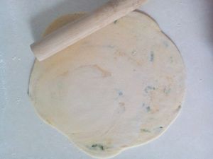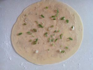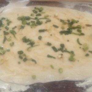 将面团分成小份擀成面片。涂抹上葱油,和腌好的葱,