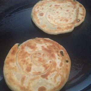 平底锅放油大火热锅,油热后小火烙饼。双面金黄即可。