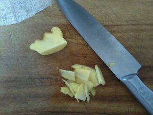生姜洗净削皮拍碎,接着再用刀剁碎。(可以用搓丝器,料理机和榨汁机)