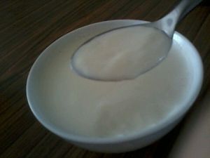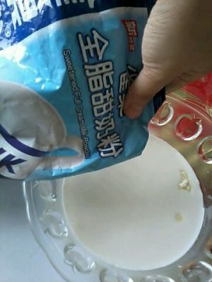 姜汁备好后,准备牛奶,牛奶置于大碗中,再倒入一小勺雀巢奶粉,会很香的