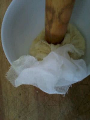 用擀面杖捣烂纱布里的姜,纱布会吸收姜汁