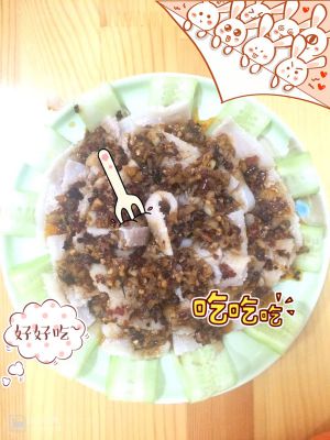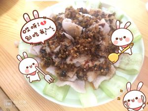 煮好的五花肉用冷水浸泡一下,因为如果直接晾凉的肉肉会粘手不好切并且吃起来油腻切大块薄片铺在配菜上方