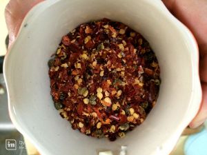 煮肉的时候我们来准备配料,大蒜全部剥皮剁碎,放在碗里,干辣椒,香叶,花椒,八角全部打碎或者自己剁碎,铺在大蒜上面(我的碗有点小,大蒜埋在下面全部看不见了)