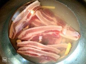 锅里放入冷水,4小粒大蒜,生姜,料酒,冷水放肉,加一小勺盐,大火煮开,转中火煮到肉熟透。我因为用的是切好的五花肉片,所以就煮了五分钟就好了,如果用的是大块的五花肉,就要多煮一段时间哦,判断的标准就是用筷子戳进肉里不会带出血水,那么再煮个两分钟就肯定熟了
