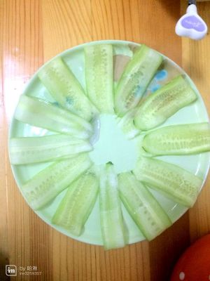 准备黄瓜,黄瓜去皮,用削皮的刨子把黄瓜刨成长长的薄片,对折一下摆在盘子里