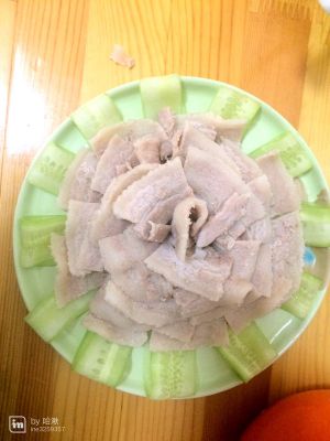 把肉洗干净直接下过煮熟,这里照片漏拍了,可以适当放一点姜片和料酒!黄瓜切长片,这里我是用刮刀刮得用无摆盘的仪式感,可以根据自己喜好来切,主要是薄一点