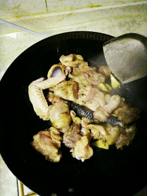 倒入鸡块,开始炒,炒到差不多鸡8成熟,把鸡的水差不多炒出来。