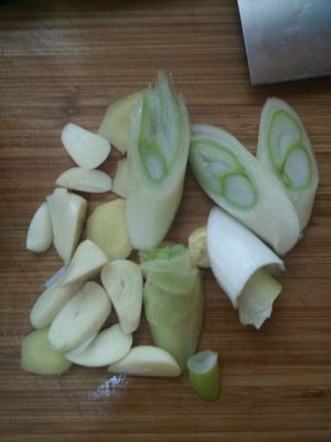 忘记拍照了。鸡肉剁块洗净放入凉水中飞水后捞出沥干水分。