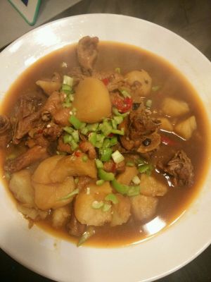 葱姜蒜切段,锅内放油,凉油放大料花椒爆香后放入葱姜蒜翻炒出香味放入鸡块继续翻炒。鸡块变色后放郫县豆瓣酱,酱油翻炒。放老抽调色,加入十三香,盐,料酒,清水。大火烧开,中火炖至鸡肉五分熟(大约半个小时,根据鸡肉老嫩决定。一般用筷子可以扎透鸡肉但是咬上去硬就是五分熟了。)