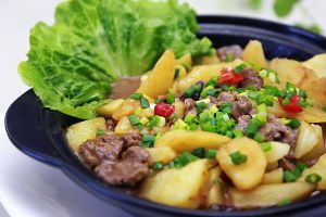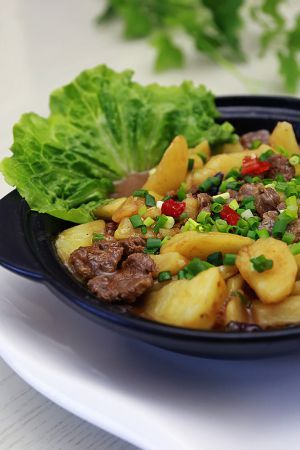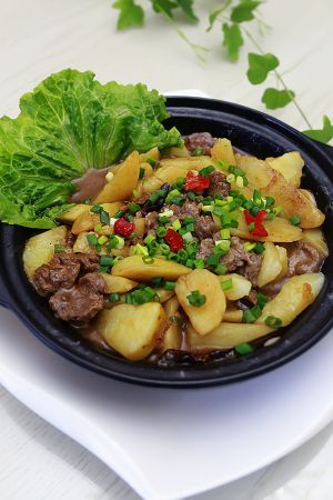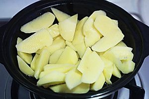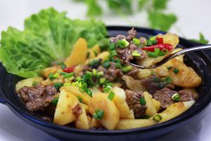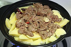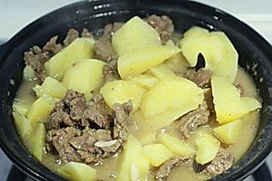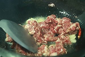 再倒西红柿、土豆、牛肉爆炒五分,加入老酒。