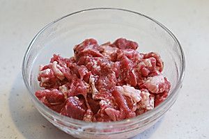 牛肉切片,加入五香粉、生粉、少量油、蚝油和盐抓腌;