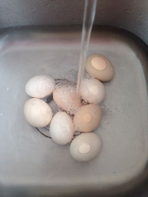 待表皮冷却后,用双手各拿起一个鸡蛋,相互敲击,使鸡蛋的外壳形成裂纹。(也可以彻底去皮)