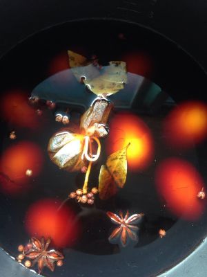 锅中倒入清水,大火煮开后,放入茶叶,然后把花椒,大料,香叶,葱段和姜片放入。等水再次煮开时,放入盐,糖,生抽和老抽搅匀。