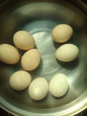 鸡蛋洗净放入锅中,加入清水没过鸡蛋的表面,大火加热,煮开后,调成中火继续煮8分钟。