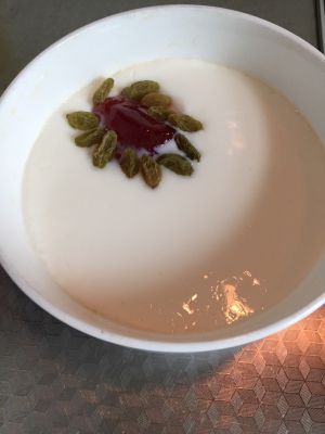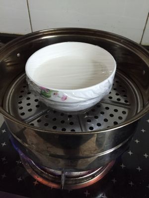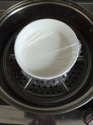 然后把牛奶放锅里隔水蒸十到十五分钟,最好是碗上包一层保鲜膜