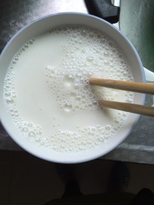 冷却好的牛奶轻挑奶皮,把小碗牛奶全部倒入有蛋清的大碗里