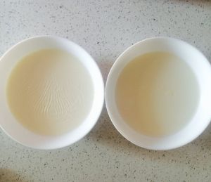将有一层的牛奶 轻轻倒入搅拌均匀的蛋清中。过程中尽量不要弄坏奶皮,并留下少许牛奶在碗中。