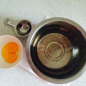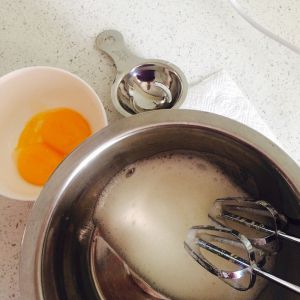 拿一个空的大碗中放入二只蛋清(蛋清蛋黄分离的方法想必大家都会的,就不多说了)、二勺糖,搅匀至糖溶解(不要打太久,否则变蛋泡