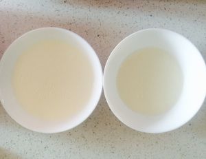把晾凉的牛奶倒入蛋清里搅拌均匀