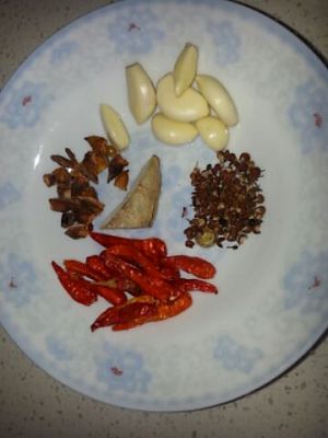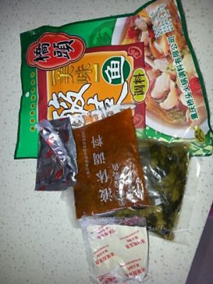 将酸菜包打开 切好 。锅內倒入一些油再将酸菜包里的油包倒入锅内加热后 将八角、姜、蒜(放一小部分)爆香。在将切好的酸菜和红椒倒入锅内翻炒至半熟盛出
