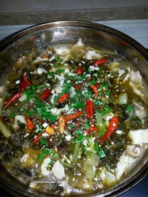 锅里热油,稍微多一点,加上半包酸菜鱼调料,适量豆瓣酱爆炒,炒出香味后加入酸菜丝、八角、茴香、花椒、姜片、蒜瓣炒香,然后加入适量的水,水开后先放入鱼头煮,多滚几下至油和水比例大致为1:1时,加入鱼块,加入大葱,加入红辣椒,加入生抽、鸡精,4-5分钟之后起锅(时间由鱼块大小而定),撒上葱花即食!