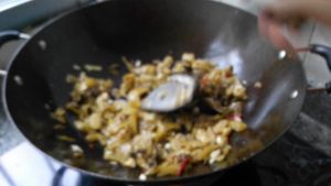 4.煎好鱼骨后下酸菜,加适量的水,下盐,蚝油,鸡汁和一点点酱油,泡椒翻搅均匀煮开