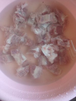排骨洗净冷水泡下,然后放料酒 酱油 生粉拌匀