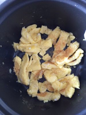 锅中起油,开小火,先放鸡蛋炒,不要炒的太过火,炒熟就先捞出来